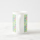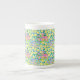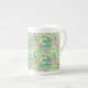 Un tazón de porcelana de huesos muy bonito, con un patrón de primrosis rosa, amarilla y azul, de un diseño acuarela pintado a mano por Judy Adamson.