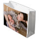 Gran bolso blanco de regalo de primera Navidad para bebé con foto y texto cambiables - puedes agregar tu foto, nombre de familia y año. Fotografía © Storytree Studios, Stanford, CA