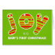 Díganle a su familia y amigos que esta será la Primera Navidad de su Bebé con esta hermosa tarjeta de anuncio. Un diseño colorido con la palabra JOY muy grande y decorado con rayas verdes y rojas y estrellas blancas. Las buenas noticias hacen que esta festividad sea aún más especial.