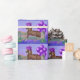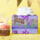 Caballo con el gorra púrpura y los globos púrpuras al lado de una cerca con un lazo. El cumpleaños o el otro papel de envoltorio para regalos de la ocasión.