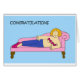 Una mujer personalizado tendida en una tumbona con jeans y zapatos rosados y dos arcos rosados cubriendo su mitad superior. La imagen tiene un fondo azul pastel y dice "Felicitaciones".