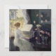 La Sonata (1911) de Childe Hassam es una pintura de retrato vintage de arte fino impresionista que presenta a una mujer tocando el piano cerca de una ventana abierta y flores rosadas en floreros.