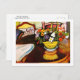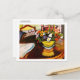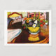Postal con la pintura, Vida fija con almohada (1911) de agosto de Macke (1887-1914). Era un expresionista alemán y un miembro prominente del grupo Der Blaue Reiter (El jinete azul). El cuadro representa un jarrón amarillo de cerámica lleno de flores silvestres sobre una mesa de comedor, en la silla hay una almohada adornada con un gráfico de ciervos.