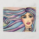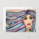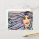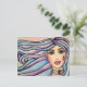 Bonita postal con un retrato acuático de ilustracion de un joven chica con ojos azules, labios rosas, delicados y femeninos, cabello largo en tonos azules y violetas.