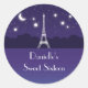 Elegante pero divertido pegatina dulce dieciséis. Ofrece una escena nocturna de la Torre Eiffel con la luna y las estrellas. Capturando a un pegatina de ojos genial para un joven chica con un sentido de la moda y un sabor discriminante. Diseño romántico y de moda. Utilícelo para favores o para sellar sobres. Añade tu propia redacción.