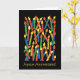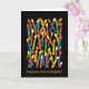 Una tarjeta de cumpleaños brillantemente coloreada con las velas y "feliz cumpleaños" en francés, de un collage de papel pintado a mano de Judy Adamson. El interior se deja en blanco para su propio mensaje.