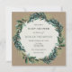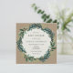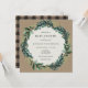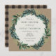 La rústica invitación a bañarse en una ducha de temática invernal presenta un marco verde de invierno y pinos verdes con fondo de papel Kraft y motivos a cuadros. Personalice su información o haga clic en "Haga clic en el personalizar más adelante" para editar estilos de fuente, tamaño y colores.