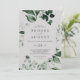 Esta invitación a una boda casual gris esmeralda y verde es perfecta para un boda boho. El diseño es elegante y rústico, con unas hojas de acuarela verde oscuro y un eucalipto con un toque bohemio moderno.