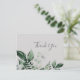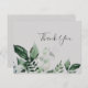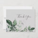 Esta tarjeta de agradecimiento gris esmeralda es perfecta para un boda boho. El diseño es elegante y rústico, con unas hojas de acuarela verde oscuro y un eucalipto con un toque bohemio moderno. Personalice la parte posterior de la tarjeta con sus nombres y un mensaje de agradecimiento. Como alternativa, deje en blanco la sección de plantilla de mensajes de agradecimiento para escribir a mano una nota personalizada en cada tarjeta después de su llegada. Estas tarjetas se pueden usar para un boda, una ducha de novia o cualquier evento especial.