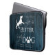 Proteja su portátil cuando esté de viaje con una vida mejor con una manga de portátil para perros. El diseño de la manga portátil presenta un fondo rústico de madera de color azul profundo con el lema "La vida es mejor con un perro", con una huella de pata y adornos de silueta canina. También hay artículos de regalo adicionales disponibles con este diseño.