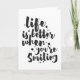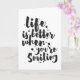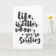 Tarjeta de saludo inspiradora que muestra la frase "La vida es mejor cuando sonríes" en escritura de pincel negro con una textura de tinta orgánica para lograr un auténtico aspecto con letras a mano.