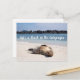 Postal con un León del Mar de Galápagos, escena clásica de Galápagos y texto "La vida es una playa en las Galápagos"