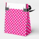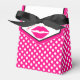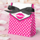 Caja de regalo de carnero de bonito hecha en un patrón de puntos de polka rosa caliente y blanco, con una solapa frontal blanca y negra delineada en rosa. Gráficos de una impresión de lápiz labial rosa, en la solapa, y texto rosado leyendo Gracias. Estupenda caja de regalo para ese pequeño regalo especial de agradecimiento a sus damas de honor o como cajas de favores de partido para cualquier evento de niñita.