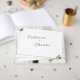 El diseño del libro de Bodas White Lace y Rosa Leaves incluye los nombres de las novias y novios en la portada con letras de plata decorativas. El fondo muestra la imagen de encaje blanco. Las hojas de rosa verdes se colocan delicadamente en las esquinas. El reverso muestra la imagen de fondo de una novia y un novio rodeados por la imagen de encaje blanco.