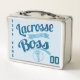 Lacrosse Almuerzo Metalizado Tin. Añade tu propia elección de nombre y número a la lata para hacer un gran almuerzo personalizado, para la escuela, universidad, oficina o viajes! Utilice los cuadros de texto en el lado derecho de la imagen. Diseño de guiones en tonos azules con el texto LACROSSE COMO UN JEFE y una barra lacrossa y gráfico de bola.