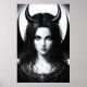 Un retrato en blanco y negro de una joven dama demonio con largos cabellos y cuernos negros. Este es un arte generado por IA.