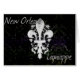 Tarjeta de nota temática de New Orleans con la flor de lis del trabajo del hierro, colores del carnaval y una de nuestras palabras preferidas…