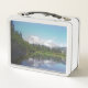 Un colorido ilustracion digital del Monte Rainier, el paisaje circundante y el cielo azul que se refleja en las aguas residuales de un lago. La obra de arte tiene un borde gris. Debajo de la imagen está el título: Parque Nacional Bench Lake Mount Rainier, Washington, dentro de una frontera y en el mismo color gris. Derechos reservados ©2019 Kimberly J Tilley.