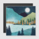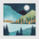 Un hermoso paisaje con texturas únicas que muestran un paisaje de lago montañoso con una luna en alza y un cielo estrellado en tonos azules, dorados, verdes y turquesas.