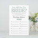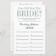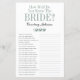 Esta encantadora hoja de juegos para la fiesta de despedida de soltera con ¿Cuántos años tenía la novia? en la parte delantera y ¿Cuánto conoces a la novia? en la parte trasera es simple y encantadora, perfecta para tu fiesta. Estos juegos divertidos y fáciles seguramente traerán mucha risa a tu fiesta de despedida de soltera. Haz que familiares y amigos te envíen fotos de la novia a diferentes edades y haz que las impriman. Numéralas y colócalas cerca de estas hojas de juego. Simplemente da una hoja a cada invitado (no te olvides de los bolígrafos) y deja que comience la competencia para el primer juego. Te sorprenderás de cuántas personas realmente conocen las edades de la novia. Luego voltea la hoja y da a los invitados 5 minutos para responder a las preguntas. Descubrirás quién realmente conoce a la novia. En segundos puedes