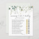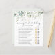 Este diseño presenta un juego de Baby Shower "Adivina quién - mamá o papá" al estilo acuarela con hojas de eucalipto. En la parte superior de la tarjeta, el efecto verdoso y dorado es confetti. El texto "mamá o papá" está escrito en letra de guión con el corazón unido.