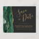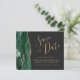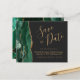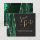 Este elegante presupuesto ahorra la tarjeta de fecha con un borde de agujeros de color verde esmeralda recortado con falso purpurina de oro. El texto del personalizable combina guiones de escritura a mano de color dorado, copperplate y tipografías cursivas en un fondo negro de pizarra. El reverso presenta un diseño de ágata dorado y verde esmeralda a juego.