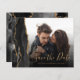 Esta elegante tarjeta horizontal para guardar la fecha presenta un borde de agate color agua negro recortado con un falso purpurina de oro. Reemplace fácilmente la imagen de muestra con su propia foto de la futura novia y novio. El texto del personalizable combina secuencias de comandos de escritura a mano de color dorado y fuentes de copperplate; un filtro de gradiente negro ayuda a hacer que el texto aparezca. La parte posterior presenta un diseño de agate negro y oro a juego.