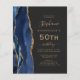 El borde izquierdo de esta elegante y moderna invitación a la fiesta de 50 años cuenta con una barra color agua azul marino bordeada por un falso purpurina de oro. El texto del personalizable combina la escritura a mano de color dorado, las fuentes de copperplate y cursiva sobre un fondo negro de pizarra. El reverso presenta un diseño de agate azul marino y oro a juego.