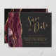 Este elegante presupuesto ahorra la tarjeta de fecha con un borde de agujeros color agua burdeos recortado con falso purpurina de oro. El texto del personalizable combina guiones de escritura a mano de color dorado, copperplate y tipografías cursivas en un fondo gris carbón. En el reverso se puede apreciar un diseño burdeos y agate dorado a juego.