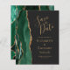 El borde izquierdo de esta elegante y moderna boda, salvo la tarjeta de fecha, cuenta con un borde de batido de color verde esmeralda recortado con un falso purpurina de oro. El texto del personalizable combina la escritura a mano de color dorado, las fuentes de copperplate y cursiva sobre un fondo negro de pizarra. El reverso presenta un diseño de ágata dorado y verde esmeralda a juego.