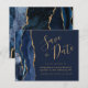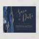 Este elegante presupuesto ahorra la tarjeta de fecha presenta un borde de agate color agua azul marino recortado con falso purpurina de oro. El texto del personalizable combina guiones de escritura a mano de color dorado, copperplate y tipografías cursivas en un fondo azul marino. El reverso presenta un diseño de agate azul marino y oro a juego.