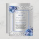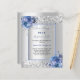 Un fondo falso plateado decorado con rosas azules, flores y confeti. Personalice y agregue un nombre y detalles del fiesta. Cartas negras. Texto: Algo azul antes que yo. 1 hoja = 1 borde impreso de invitación al borde.