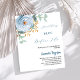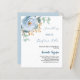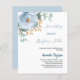 Un fondo blanco moda. Decorada con una flor azul polvorienta, flor rosa y hojas de eucalipto de color verde acuático, brotes, vegetación y una falsa primavera dorada. Personalice y agregue el nombre de la novia a ser y detalles. Texto: Algo azul antes que yo. 1 hoja = 1 borde impreso de invitación al borde.