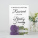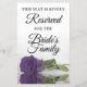 Estas tarjetas de tamaño superior están diseñadas para que los clientes sepan qué asientos están reservados para la familia de la novia. El diseño es elegante y cuenta con un rosa de color malva, que se refleja en una piscina de agua con olas y olas. El texto del personalizable dice: Este asiento está amablemente reservado a la Familia de la Novia.