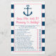 Estas adorables tarjetas de juegos de Adivina de quién lo dijo mamá o papá son una divertida actividad en Baby Shower. Simplemente pasen por ahí durante el Baby Shower donde los invitados tendrán la diversión de adivinar quién dijo cada declaración: mamá o papá. Este adorable diseño náutico cuenta con un bonito ancla con adornos cardíacos.