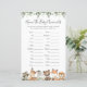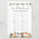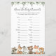 La tarjeta de juego de los animales de la zona de madera con la temática de los animales de la zona de la ducha para bebés incluye un ilustracion de animales de la zona de bosque de acuarela y una vegetación de color acuático eucalipto garland y un elegante tipo de letra manuscrita.