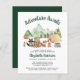 Invitación rústica y económica a la rociada de bebés con un lindo ilustracion de animales de bosque acampando en las montañas y el bosque con su tienda y fogata, y "Adventure Awaits" y el nombre de la futura madre en un guión verde oscuro para los cazadores.