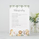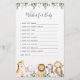 Los animales de safari con temática de la ducha de bebé desea una tarjeta de juego para bebés, cuentan con un ilustracion de animales de safari acuarela y un paisaje de eucalipto de color de agua y elegante fuente de estilo manuscrito.