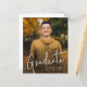 Una tarjeta de anuncio de graduación con 2 fotos Presupuesto con fuente manuscrita y foto de retrato de sangrado total en la parte frontal con nombre y detalles de graduación. La parte posterior tiene una segunda foto con detalles adicionales. Haga clic en el botón de edición para personalizar este diseño.