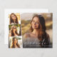 Anuncio de graduación elegante y económico que presenta la foto del graduado superpuesta con una tira de tres fotos cuadradas más pequeñas, "graduado" en un guión blanco moderno y su nombre y año de clase en tipografía blanca simple.