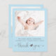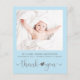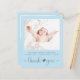 Un simple y dulce bebé amigable con el presupuesto gracias al anuncio de su nacimiento con tipografía gris suave y moderna contra un fondo azul pastel. La parte delantera incluye la foto, el nombre, la fecha de llegada y las estadísticas de nacimiento de su bebé, y "gracias" escrito en un guión de moda, con un corazón que se une a las dos palabras. Al revés, agrega una foto adicional, y personaliza un mensaje de agradecimiento y nombres de padres y hermanos bajo una flecha linda coordinadora con un corazón en el medio.