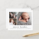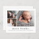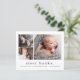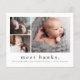Un dulce anuncio de nacimiento de collage de fotos con un sencillo nombre moderno con 3 fotos en la parte delantera. La parte posterior tiene un gran encabezado de nombre completo y un mensaje personal de la familia. Haga clic en el botón de edición para personalizar este diseño con sus fotos y detalles.