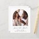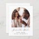 Esta sencilla y minimalista tarjeta Save the Date incluye un arco fotográfico sobre las palabras "Save the Date" en un elegante guión de escritura a mano en negro, seguido por los nombres de la pareja, la fecha boda y la ciudad en letra sans serif sobre un fondo blanco. Añada un mensaje más detallado con información adicional sobre el reverso, junto con un código QR que envía invitados a su sitio web boda.