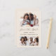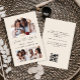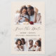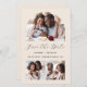 Esta sencilla y minimalista tarjeta Save the Date incluye una foto en forma de arco en la parte superior y dos fotos cuadradas en la parte inferior. En el medio, las palabras "Save the Date" aparecen en un elegante guión de escritura a mano en negro, seguido por los nombres de la pareja, la fecha boda y la ciudad en letra sans serif en un fondo beige. Agregue un mensaje más detallado con información adicional en la parte posterior, junto con un código QR para ayudar a sus invitados a visitar el sitio web de su boda.