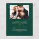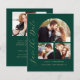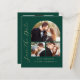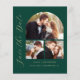 Esta simple y minimalista tarjeta Save the Date incluye un arco de collage de fotos, con una foto horizontal en la parte superior y dos fotos cuadradas debajo. Las palabras "Save the Date" se ejecutan verticalmente en el margen izquierdo en un elegante guión de escritura a mano de color dorado. Los nombres de la pareja, la fecha del boda y la ciudad aparecen debajo del collage de fotos en sans serif con fondo verde esmeralda. Añada una cuarta foto horizontal y un mensaje más detallado con información adicional en la parte posterior.