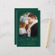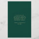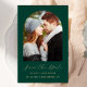 Esta sencilla y minimalista tarjeta Save the Date incluye un arco de fotos encima de las palabras "Save the Date" en un elegante guión de escritura a mano de color dorado, seguido por los nombres de la pareja, la fecha boda y la ciudad en letra sans serif en un fondo verde esmeralda. Añada un mensaje más detallado con información adicional sobre la marcha atrás.
