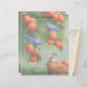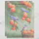 Dos pájaros planos occidentales se colocan en un melocotón, mientras que un tercer pájaro se sienta en una cesta de madera tejida llena de fruta recién cosechada lista para el mercado. Acentuado con un fondo con motivos azules coincidente.