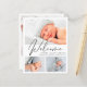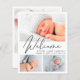 Un simple y elegante anuncio de nacimiento con presupuesto ajustado con un collage de 3 fotos de tu recién nacido con "Bienvenida" en un elegante y moderno guión. Añada el nombre, la fecha de nacimiento y las estadísticas de nacimiento de su bebé. En la parte posterior, agregue otra foto y un mensaje personalizado.