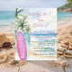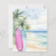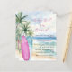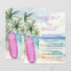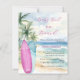 An elegant invitation for a Baby Shower, A watercolored sandy beach, ocean waves and palm trees as background, and a pink and blue surfboard on the beach.