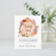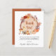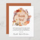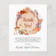 Cuidada tarjeta de agradecimiento para una ducha de bebé de bajo presupuesto con un diseño rústico otoñal que incluye un ilustracion acuarela de una corona compuesta por un tronco de árbol, animales de bosque (búho, ciervo, ardilla y zorro), flores de otoño y calabazas y "¡Gracias!" escrito en un guión de terracota. Personaliza tu mensaje de agradecimiento y agrega tu(s) nombre(s) en un script de firma, o deja en blanco una nota manuscrita.